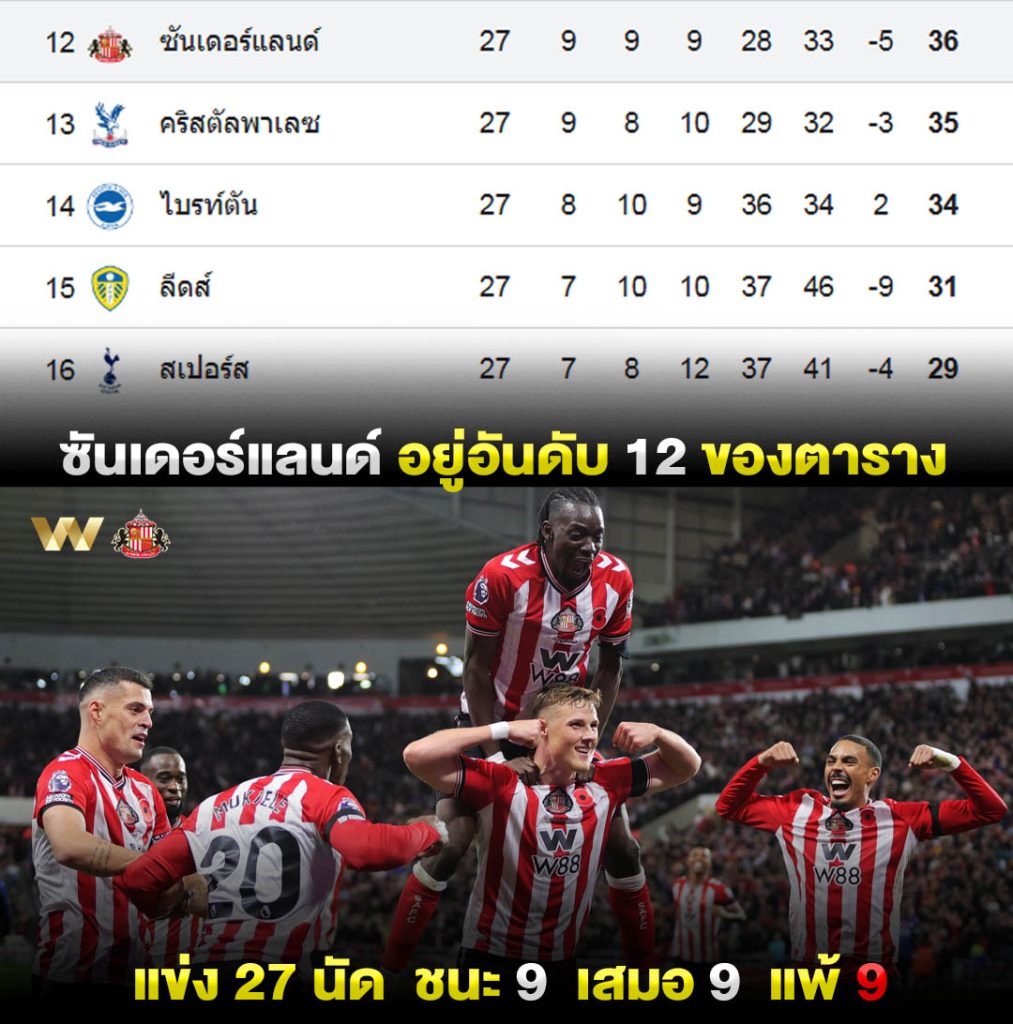 ผลงานของ ซันเดอร์แลนด์ ในศึกพรีเมียร์ลีก ฤดูกาล 2025/26 (ข้อมูลล่าสุด ณ วันที่ 25 กุมภาพันธ์ 2026) ถือว่าเป็นการกลับมาสู่ลีกสูงสุดที่น่าสนใจและมีมาตรฐานที่ดีสำหรับทีมที่เพิ่งเลื่อนชั้นขึ้นมาครับ