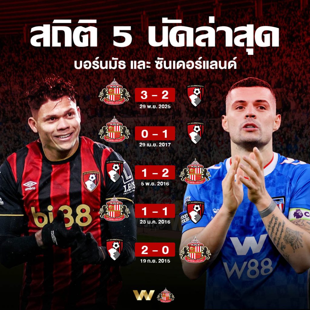 นี่คือสถิติการพบกัน 5 นัดหลังสุด ในทุกรายการระหว่าง บอร์นมัธ และ ซันเดอร์แลนด์